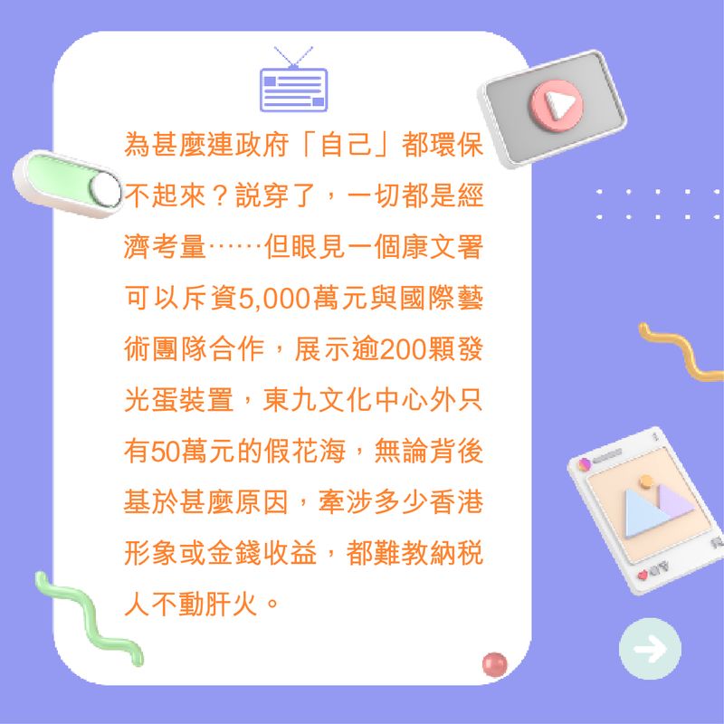 為甚麼連政府「自己」都環保不起來?說穿了,一切都是經濟考量。有報道稱,東九文化中心外的長階梯原本打算種植真的杜鵑花,基於「技術考慮及支出預算所限」,這個安排只好作罷。如果財赤嚴重到省得一元是一元的地步,這是無可厚非,但眼見一個康文署可以斥資5,000萬元與國際藝術團隊合作,展示逾200顆發光蛋裝置,東九文化中心外只有50萬元的假花海,無論背後基於甚麼原因,牽涉多少香港形象或金錢收益,都難教納稅人不動肝火。